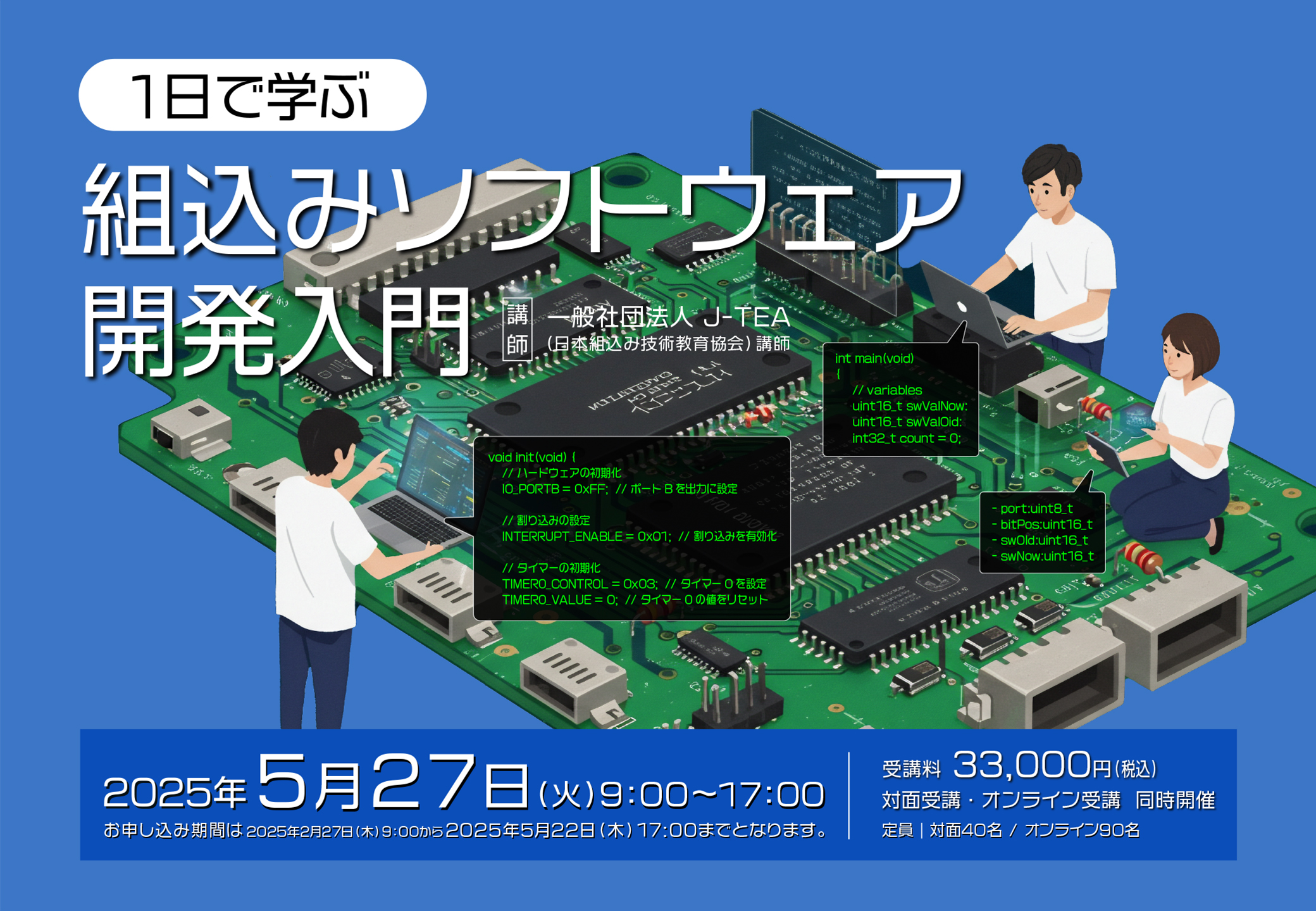 17:00までに、下記(講座・セミナー等 申込)ボタンより 「1日で学ぶ組込みソフトウェア開発入門」の対面またはオンラインを選択してお申込みください |